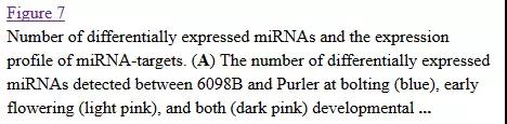c) IDEG6軟件分析( |FC| >2)進(jìn)行差異表達(dá)分析,兩個(gè)時(shí)間點(diǎn)在兩個(gè)品系間分別檢測(cè)得到45、65個(gè)差異表達(dá)microRNA。值得注意的是,如圖7所示,除了miR1140 與miR827, 抽薹時(shí)間點(diǎn)上的所有已知 差異表達(dá)miRNAs 均在 品系Purler中上調(diào),這其中包括3個(gè)miR156 家族 與6個(gè) miR395 家族microRNA,相反,花發(fā)育早期時(shí)間點(diǎn)上的所有差異表達(dá)miRNAs 均在 品系Purler中下調(diào)。