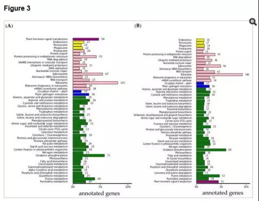 d)對(duì)兩個(gè)時(shí)間點(diǎn)所有差異基因進(jìn)行KEGG通路分析,其中3297個(gè)基因注釋到了KEGG數(shù)據(jù)庫(kù) ,其中大多數(shù)基因注釋到了 ribosome 、oxidative phosphorylation相關(guān)代謝通路。值得注意的是,在兩個(gè)時(shí)間點(diǎn)分別有58、51個(gè)差異基因注釋到了植物激素信號(hào)通路,進(jìn)一步分析發(fā)現(xiàn),這些通路大多為BR或auxin信號(hào)轉(zhuǎn)導(dǎo)通路。該部分結(jié)果如圖3所示。