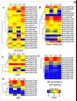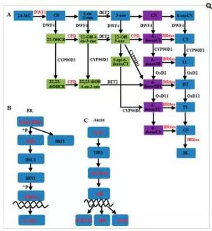 e)圖4展示了在BR生物合成、BR信號(hào)轉(zhuǎn)導(dǎo)通路、auxin信號(hào)轉(zhuǎn)導(dǎo)通路上鑒定到的差異表達(dá)基因。這些差異基因中,BR6OX調(diào)控了BR生物合成過(guò)程中multiple C-6C的氧化過(guò)程;DWRF1催化24-methylenecholesterol轉(zhuǎn)化為campesterol,該過(guò)程為BR生物合成的第一步;分布在BR信號(hào)轉(zhuǎn)導(dǎo)通路上的差異基因包括 BRI1, BSK, BZR1, and CYCD3等, 這些基因多在品系 Purler中下調(diào) (見(jiàn)圖 5E);分布在 auxin 信號(hào)轉(zhuǎn)導(dǎo)通路上的基因包括 AUX1, IAA, GH3, ARF等,其中 IAAs, GH3s, ?ARFs 在兩個(gè)時(shí)間點(diǎn)的 Purler品系材料中均表現(xiàn)為上調(diào)。