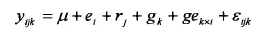 利用方差分析計(jì)算各性狀的環(huán)境方差、重復(fù)方差(有試驗(yàn)重復(fù))、遺傳方法、基因型與環(huán)境互作方差、誤差方差和遺傳力,并估計(jì)哥哥變量的遺傳效應(yīng)。方差分析的線(xiàn)性模型為: