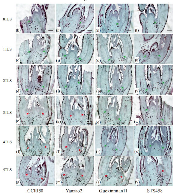 陸地棉(Gossypium hirsutum L.)是世界上最重要的纖維作物。在我國黃河流域和長江流域棉區(qū),實(shí)現(xiàn)早熟棉在小麥或者油菜后直播可以提高復(fù)種指數(shù)。而在西北內(nèi)陸棉區(qū),春季氣溫低,秋季枯霜早,早熟棉既能提高棉花的霜前花率,還可以改善棉花品質(zhì)?;ㄑ糠只怯绊懚碳久奁贩N早熟的重要性狀,是棉花現(xiàn)蕾期、開花期和成鈴期發(fā)育的基礎(chǔ),花芽分化直接影響開花時(shí)間?;ㄑ糠只侵参飶臓I養(yǎng)生長向生殖生長過渡的標(biāo)志。當(dāng)進(jìn)入生殖生長時(shí),側(cè)芽變成花芽,花芽發(fā)育成果枝。果枝分化決定了開花量、生殖能力和棉花產(chǎn)量。因此,早熟性狀及早熟棉品種在生產(chǎn)上顯得尤為重要。