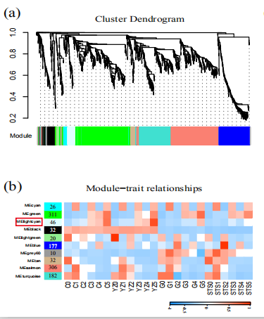 然后作者利用高分文章利器:WGCNA分析,進(jìn)行數(shù)據(jù)深度挖掘和整理,推薦大家使用百邁客云平臺(tái)小工具WGCNA模塊,可以出來和作者同樣高大上的圖片。