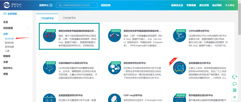 百邁客云包含農(nóng)學(xué)和醫(yī)學(xué)兩大類分析平臺(tái),醫(yī)學(xué)分析平臺(tái)主要針對(duì)人、鼠數(shù)據(jù)的分析,包含:轉(zhuǎn)錄組、非編碼RNA、單基因病外顯子、腫瘤外顯子、重測(cè)序等數(shù)據(jù)分析,以及全轉(zhuǎn)錄組聯(lián)合分析;農(nóng)學(xué)分析平臺(tái)可以應(yīng)用到更多的物種,涵蓋轉(zhuǎn)錄組、非編碼RNA、微生物、蛋白、代謝等數(shù)據(jù)的分析,以及全轉(zhuǎn)錄組聯(lián)合分析等。點(diǎn)擊左側(cè)導(dǎo)航分析->農(nóng)學(xué)或者醫(yī)學(xué)打開分析平臺(tái)列表頁面,點(diǎn)擊選擇您想要使用的分析平臺(tái),打開其詳細(xì)介紹頁面,該頁面可以看到該平臺(tái)的應(yīng)用領(lǐng)域“平臺(tái)介紹“技術(shù)背景“案例“課堂“版本記錄,點(diǎn)擊打開軟件即可進(jìn)入到參數(shù)頁面。