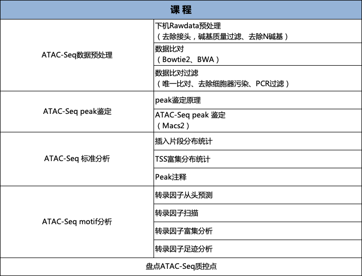 本課程主要從技術(shù)原理、實(shí)驗(yàn)步驟、生物信息學(xué)分析、文獻(xiàn)分享四大內(nèi)容向大家介紹ATAC-Seq技術(shù)。同時(shí),本課程還涉及專門的生物信息學(xué)實(shí)操課程,帶領(lǐng)大家學(xué)習(xí)ATAC-Seq基本分析流程,其中包括數(shù)據(jù)質(zhì)控、Peak Calling、Motif分析等。從而幫助大家將ATAC-Seq運(yùn)用在自己的課題當(dāng)中。
